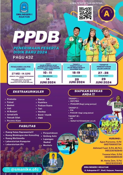 Disampaikan kepada seluruh calon pendaftar Penerimaan Peserta Didik Baru (PPDB) SMA Negeri 1KejayanTahun Pelajaran 2024/2025, bahwa SMA Negeri 1 Kejayan akan segera melaksanakan Penerimaan Peserta Didik Baru (PPDB) Tahun Pelajaran 2024/2025. Adapun pelaksanaan Penerimaan Peserta Didik Baru (PPDB) Tahun Pelajaran 2024/2025 nanti rencannya tidak jauh berbeda dengan tahun-tahun sebelumnya.
