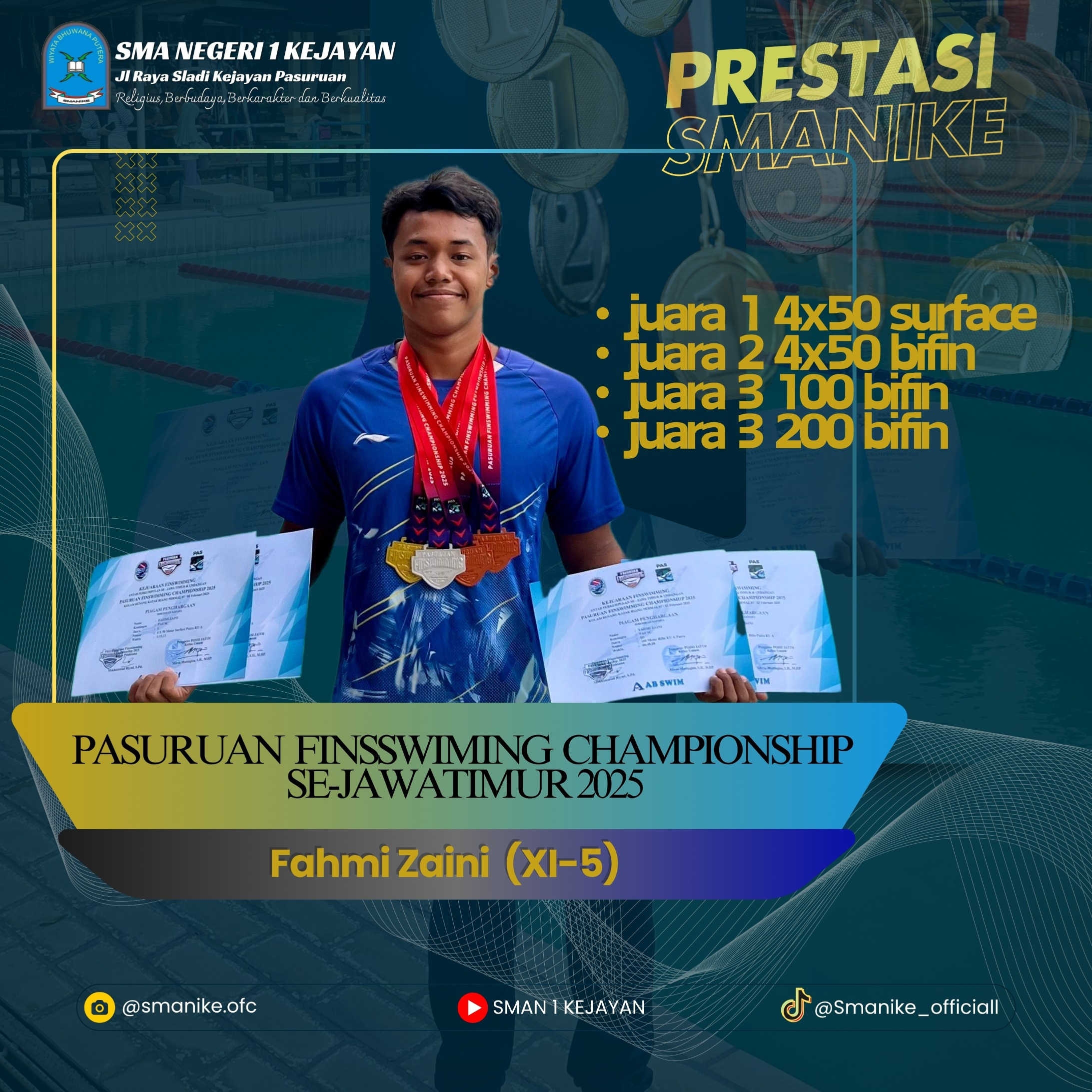 Fahmi Zaini (XI-5) membawakan prestasi kembali di ajang perlombaan PASURUAN FINSSWIMING CHAMPIONSHIP SE-JAWA TIMUR pada Tanggal 12 FERBUARI 2025.
