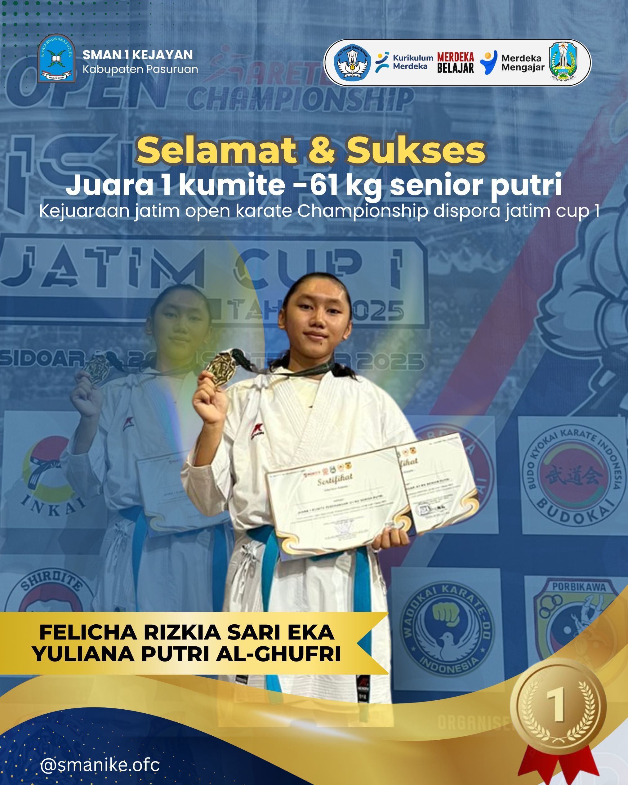 siswa yang biasa Akrab disapa kak FELICHA kembali lagi membawa nama harum sekolah dengan menjuari juara 1 komite 61 KG senior putri di jatim open karate championshlp dispora jatim cup 1 yang diadakan pada 25-26 September 2025 di Halaman Rektorat Universitas Negeri Surabaya (UNESA), Kampus Lidah Wetan, Surabaya, diselenggarakan oleh Pemprov Jatim, Dispora Jatim, dan UNESA. Dalam rangka Memperingati Haornas ke-42.