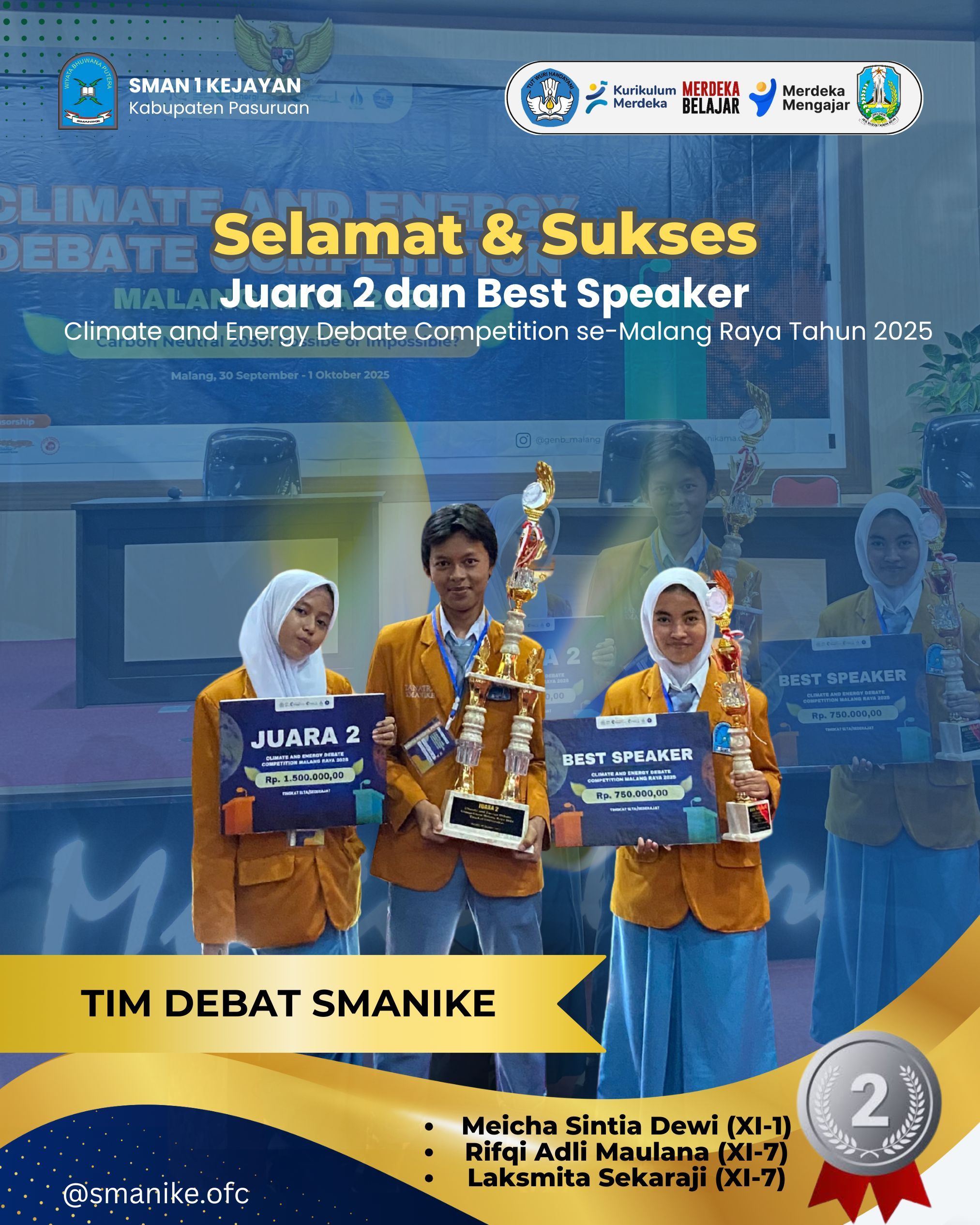 Dalam kompetisi bergengsi yang membahas isu lingkungan, iklim, dan energi tersebut, tim debat SMAN 1 Kejayan berhasil meraih Juara 2, sekaligus menyabet gelar Best Speaker atas nama Meicha Sintia Dewi (kelas X-1). Dua anggota tim lainnya, Rifqi Adli Maulana (X-7) dan Laksmita Sekaraji (X-7), turut memberikan kontribusi besar dalam keberhasilan tim ini.